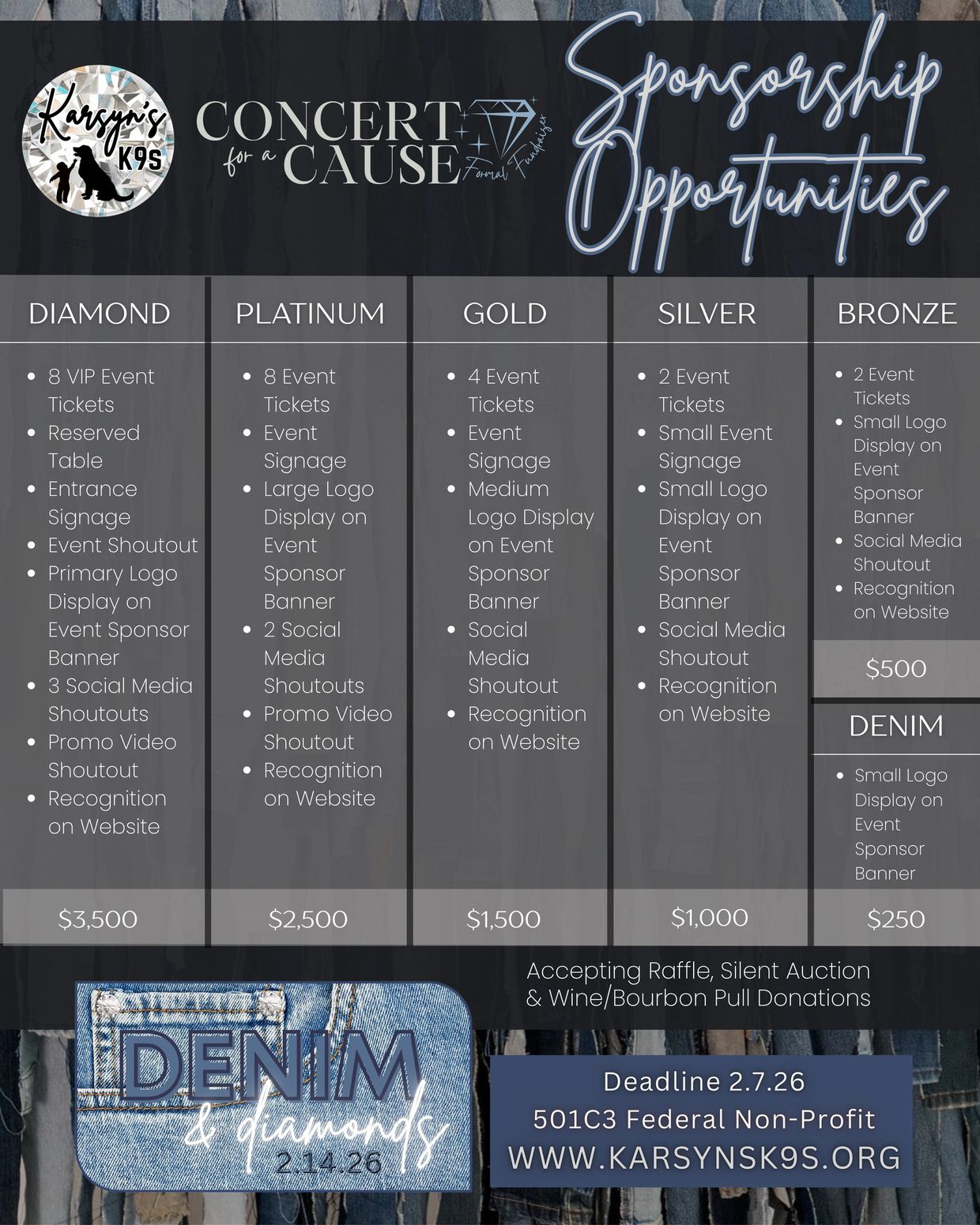 Our Concert for a Cause brings the community together for an evening of music, fun, and making a difference. Sponsorships help support Karsyn's K9 Foundation and our mission to provide service dogs to children in need. It's a great way to show your support and be part of something special right here in our community.